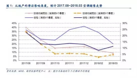 一种流行而不同于前述的观点认为,家电滞后于地产大约3个季度。不过这样推算下来的结果是,2016年4月的新房销售增速高点之后的三个季度后,2017年Q2季度的空调需求是在减弱的。但数据表明,上半年的空调需求异常火爆。准确的地产滞后期有助于对2018冷年的空调销售预测做出更为准确的判断,从而在生产、库存和市场需求等众多因素的共同影响下排产。