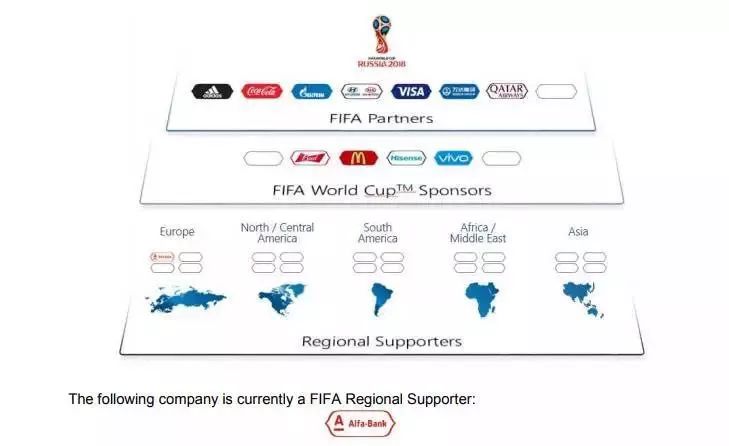 目前,国际足联共有7大合作伙伴,2016年3月与国际足联签下15年长约的万达集团就属于这个级别,此外还有阿迪达斯、可口可乐、俄罗斯天然气公司、现代-起亚、VISA、卡塔尔航空。这个级别赞助商还留有一个空缺。