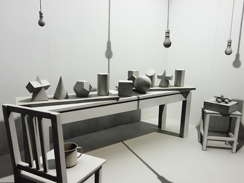 姜吉安《两居室》,艺术家在一间所有物体都处理成白色的公寓工作了近两年,给所有物体都画上了阴影。把源自于文艺复兴的光影法从绘画中抽取出来,直接使用到现实中。
