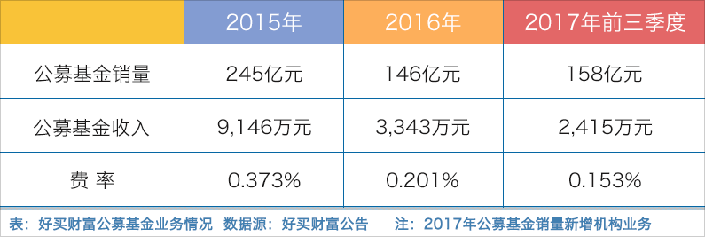 但好买财富在公募基金销售业务上想要盈利依旧比较困难。公募基金的综合销售费率已经从2015年的0.37%下降到2016年的0.2%,再降到2017年前三季度的0.15%。针对于此,好买财富2017年已减少大规模的广告投放,转而更注重渠道投放的性价比和投资者教育的精细运营。