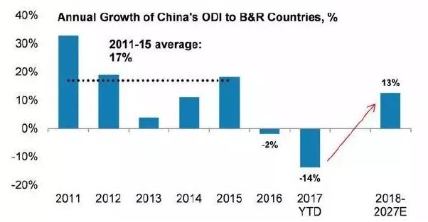 当然,在欧亚大陆桥的终端欧洲,中国资金也没有闲着。中国私募基金控股Global Logistics Properties(GLP)收购的Gazeley,在欧洲和北美均拥有仓储配送园区。10月达成的这笔并购交易价格约为28亿美元,将把Gazeley并入GLP旗下,目前GLP已经布局119个市场、1095个物流园区。大摩预计,未来十年(2018-2027)中国向一带一路沿途国家对外直接投资的年复合增长率将反弹至13%,总计达到1.2万亿美元。