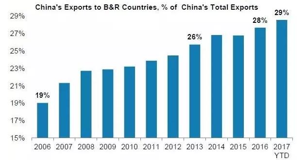 中国在2013年发起的“一带一路”倡议,覆盖65个国家48亿人口,占全球人口的44%,世界GDP的62%,贡献40%的实际GDP增长。近年来的海外物流并购投资,与BRI区域高度重叠。在2014年以来对外宣布的36宗并购交易中,有25宗位于BRI区域。一带一路沿途国家在中国出口总额当中的占比近年来也在稳步增长,从2006年的不到20%攀升至今年的近30%。