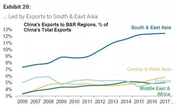 中国的企业巨头们也已入局BRI。阿里今年6月投资10亿美元,将其在东南亚领先的电商物流公司Lazada的持股比例提高至83%,这标志着对该地区物流市场的积极投入。分析指出,东南亚地区在整个BRI版图当中,在中国出口增长当中的贡献最大,远远超出其他地区。
