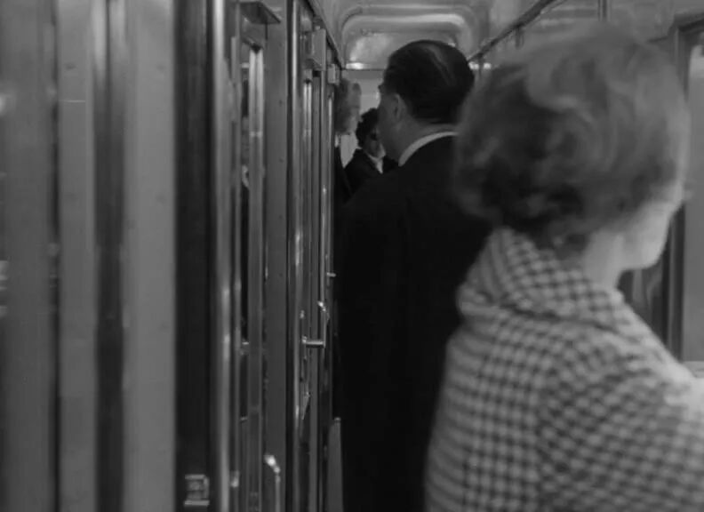 从46分钟开始到第59分钟,视线&身体&摄影机开展了一连串眼花缭乱又精心操控的同步运动,参照巴塔耶理论,此处的视线=欲望;身体=能量,摄影机=中心。原本应该以一个完整单元呈现的扒窃场景被化整为零,在Michel追踪,放弃和重新锁定猎物的过程中,被拍摄的空印象间从全景场域的站台转移到了仿佛被某个机器压缩过了的矩形车厢,摄影机持续地在彼此雷同的面孔中搜索Michel和他的同伴。