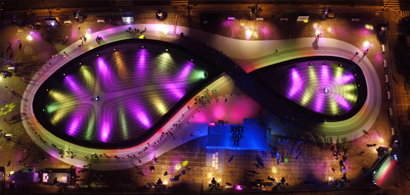 也许你对耐克用体育场地做创意的方式不陌生。实际上,这个项目沿用了耐克去年另外一个大型场地的策略——一个巨大跑鞋形状的智能体育场,当你穿上带有传感器的耐克跑鞋跑完一圈后,速度信息都被记录了下来,跑第二圈的时候,体育场的LED围栏就会显示你的图像,用你之前的速度陪你“比赛”。这个创意后来还获得了包括戛纳在内的好几个大奖。