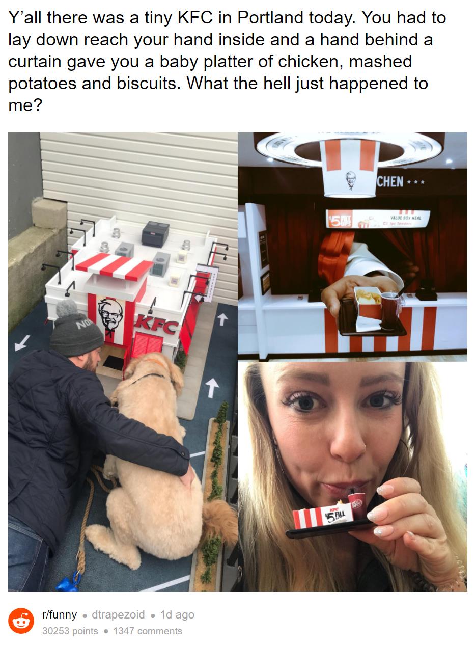 这家迷你的肯德基供应的是小土豆泥,小炸鸡,小饼干,小饼干喝一杯小Dr Pepper饮料,全都装在一个只有十二分之一大小的餐盘里。没错,这些都可以吃,而且正常大小要卖5美元的套餐,迷你版就全免费了。都装在一个只有十二分之一大小的餐盘里。没错,这些都可以吃,而且正常大小要卖5美元的套餐,迷你版就全免费了。