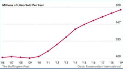 根据欧睿信息公司的统计,大家对传统碳酸饮料(可乐、雪碧等)的喜爱在迅速地下降。霸占美国人多年的碳酸饮料正在失宠,而欧洲人喜欢的气泡水 (Sparkling Water)在美国越来越流行了,并形成健康认知,成为流行。