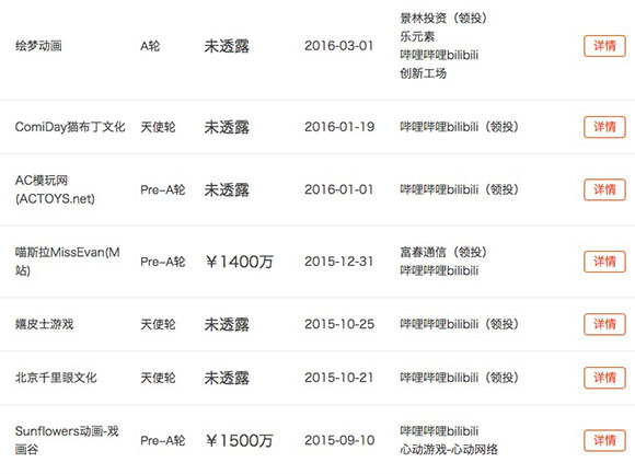 其它几笔千万级以上的投资分别是针对文化创意产业,排序依次是南京米漫文化、上海欣雨动画设计公司、厦门翼下之风动漫、珠海嬉皮士网络科技。其中南京米漫文化也在4500万人民币以上规模。