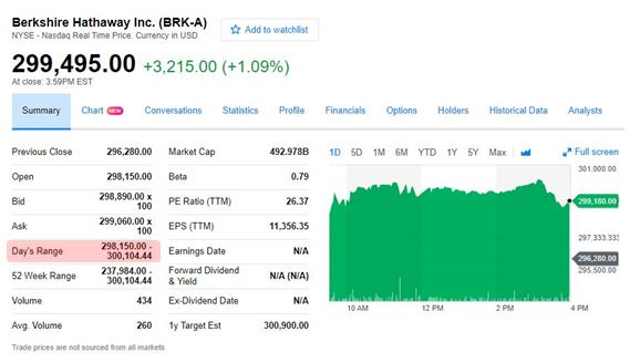 A类股最终收涨1%,距离30万美元大关仅差505美元,或0.2%。B类股收涨0.87%,报于199.50美元的历史新高。
