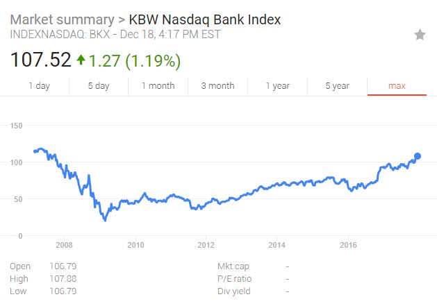 受税改在本周落地的预期提振,金融板块领涨标普500指数,追踪美国14家大银行的KBW纳斯达克银行指数日内涨1.5%,收涨1.2%,与历史新高相差不足2美元。富国银行和美国银行也均收涨超1.5%。