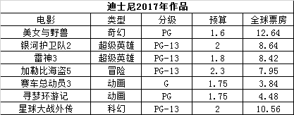 迪士尼每年的套路很明确,就拍几部大片,数量在所有六大公司中是最少的,单片平均投资量是最高的。比如今年,就《美女与野兽》、《银河护卫队2》、《雷神3》、《加勒比海盗5》、《赛车总动员3》、《寻梦环游记》、《星球大战外传》七部,奇幻、超级英雄、冒险、动画、科幻几个大类。除了皮克斯原创的《寻梦环游记》,其他全是续集、重启。