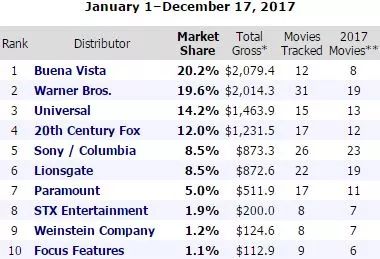 迪士尼(发行品牌是Buena Vista)和福斯都是业绩排在前四的好莱坞大制片公司,两家去年合计占到39%的电影市场份额,今年截止目前是32.2%。
