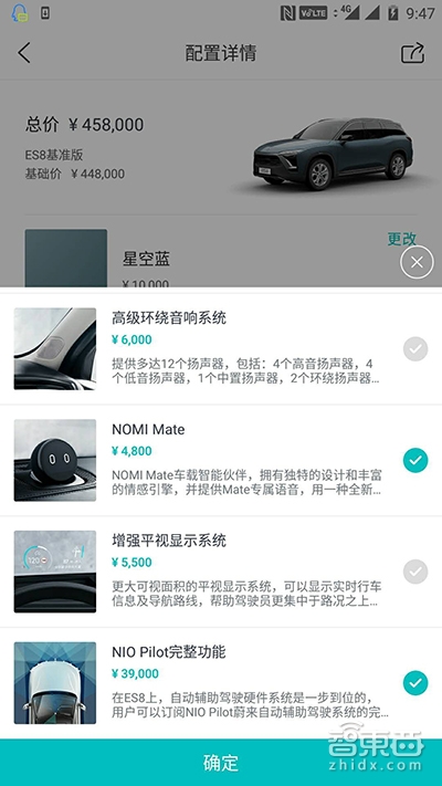 同样需要额外掏钱的,还有ES8上的智能助手NOMI,在蔚来ES8的订购页面上,选配NOMI的价格是4800元,说好的基础版标配智能助手呢?