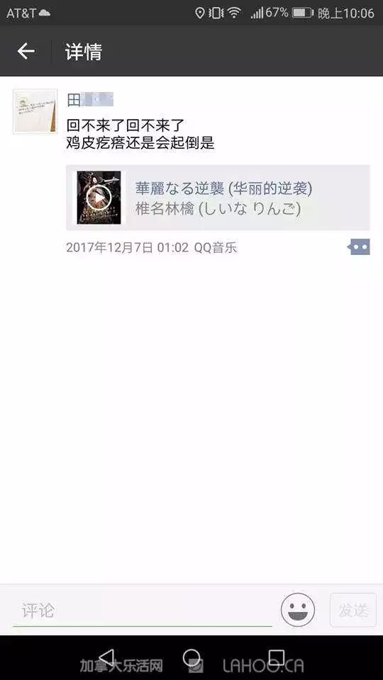 Tian自杀前发送的最后一条朋友圈,分享了一首叫《华丽的逆袭》的歌曲。这首歌由Tian最喜欢的日本歌手椎名林檎演唱,是一首充满斗志的歌,Tian却说“回不来了”。