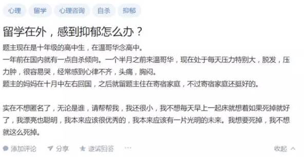 海外发生留学生自杀身亡的案例并非少数;很多人将自杀者和loser联系在一起,他们觉得自杀的人是没有勇气面对生活中的一切才会选择结束自己生命的。但留学出国背后的艰辛,没有经历过的人很难懂。