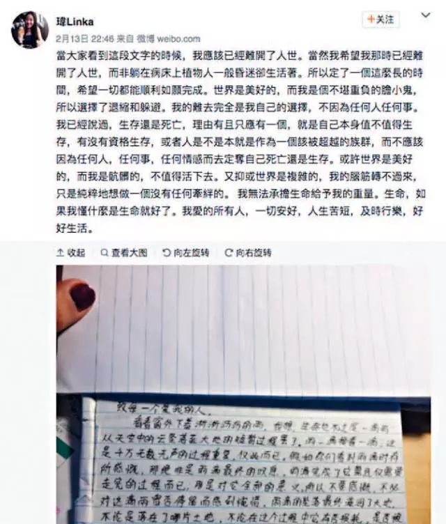 今年2月,来自广州的20岁加州大学留学生刘维维(Weiwei Liu)自杀身亡。在别人眼中,她是个阳光、积极向上、品学兼优的小天使,而这样的她却被发现在宿舍内失去呼吸。她自杀前,定时写好微博遗书,向外界宣告自己,无法承担生命的重量。