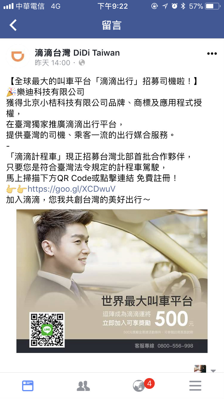12月18日,滴滴出行在社交平台Facebook上以滴滴台湾(DiDi Taiwan))的名义发布司机招募信息。