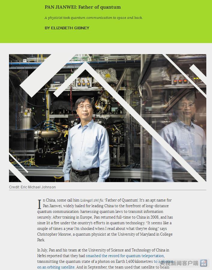 在国际学术期刊《自然》最新公布的2017《自然》十大科学人物中,中国物理学家潘建伟入选。《自然》指出,在潘建伟的带领下,中国成为远距离量子通信技术的领导者。