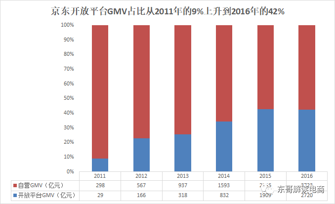 京东财报数据,开放平台GMV占比从2011年的9%已经上升到2016年的42%,而今年双十一,京东服饰家居品类在所有商品品类中下单量名列第一。而开放平台交易额当中近一半是由服饰品类贡献的。