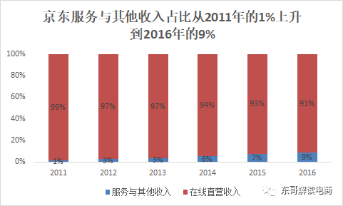 服饰作为电商毛利率较大的品类,由于广告等收入的作用,对京东服务费等其他收入的贡献巨大,而从京东财报中可以看到服务收入已经从2011年的1%上升到2016年的9%。