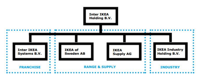 1980年代,宜家创始人坎普拉德就在荷兰成立了母公司,现在名为英特宜家(Inter IKEA),它利用荷兰子公司英特宜家系统(Inter IKEA System)从全球各地的宜家专营业务中收取相当于所有宜家商店收入3%的费用。英特宜家主要负责零售生意,而英特宜家系统(Inter IKEA System)主要负责零售门店的特许经营授权。