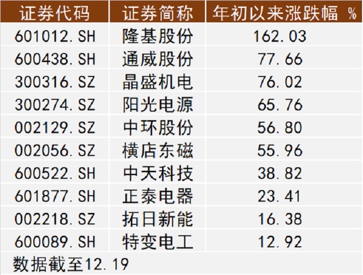 截至12月19日收盘,隆基股份(601012.SH)、通威股份(600438.SH)、晶盛机电(300316.SZ)、阳光电源(300274.SZ)、中环股份(002129.SZ)领涨A股光伏板块,其今年年初以来的股价涨幅分别为162.03%、77.66%、76.02%、65.76%、56.80%。