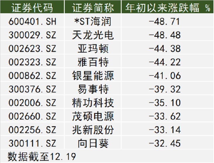 根据界面新闻记者进一步统计,以Wind太阳能发电指数收录的成分股为参考,截至12月19日,34家企业今年以来股价下跌。*ST海润(600401.SH)、天龙光电(300029.SZ)、亚玛顿(002623.SZ)、雅百特(002323.SZ)以及银星能源(000862.SZ)领跌,股价跌幅分别为48.71%、48.48%、44.38%、44.22%、41.06%。