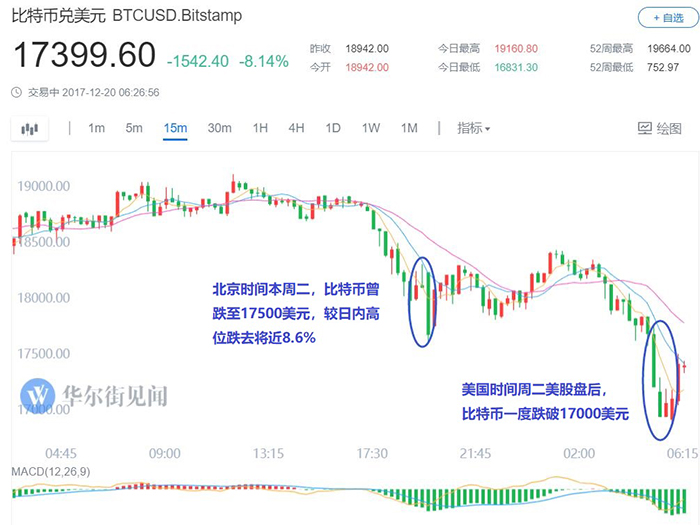 CNBC援引Coinbase数据称,此后比特币交易价一小时内从17929美元跌至16912美元。彭博称,比特币跌幅曾达到10%,创本月10日比特币期货上市前夕以来最大日内跌幅。