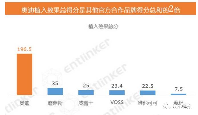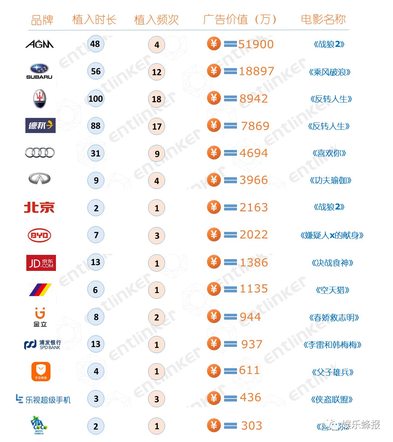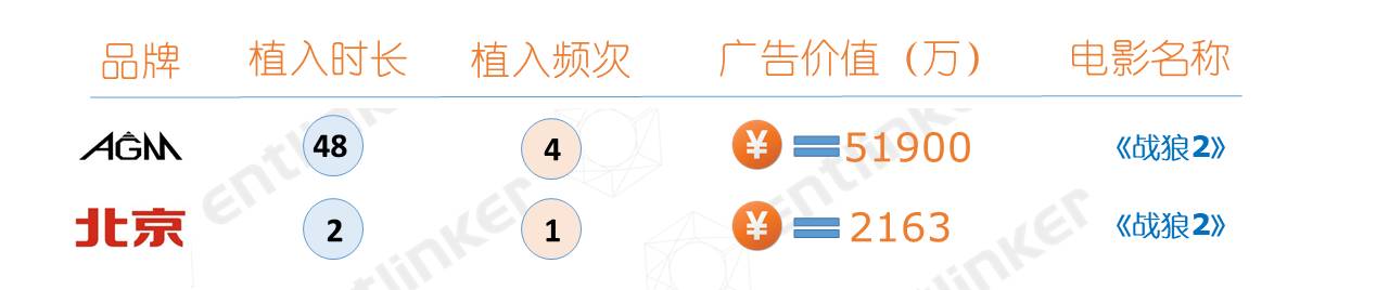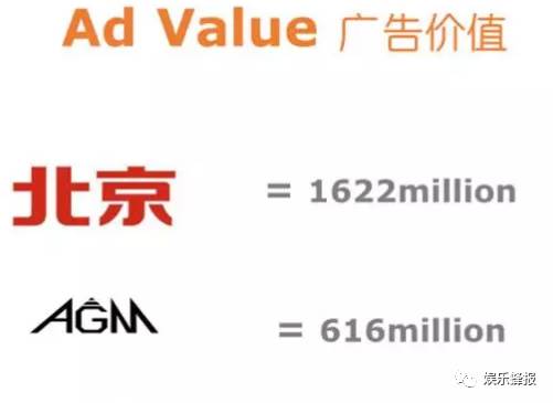 8个品牌植入,官方合作品牌6个,北汽以1000倍的投资回报比成最大赢家。而AGM的广告展现效果是最好的,广告价值远超平均值。