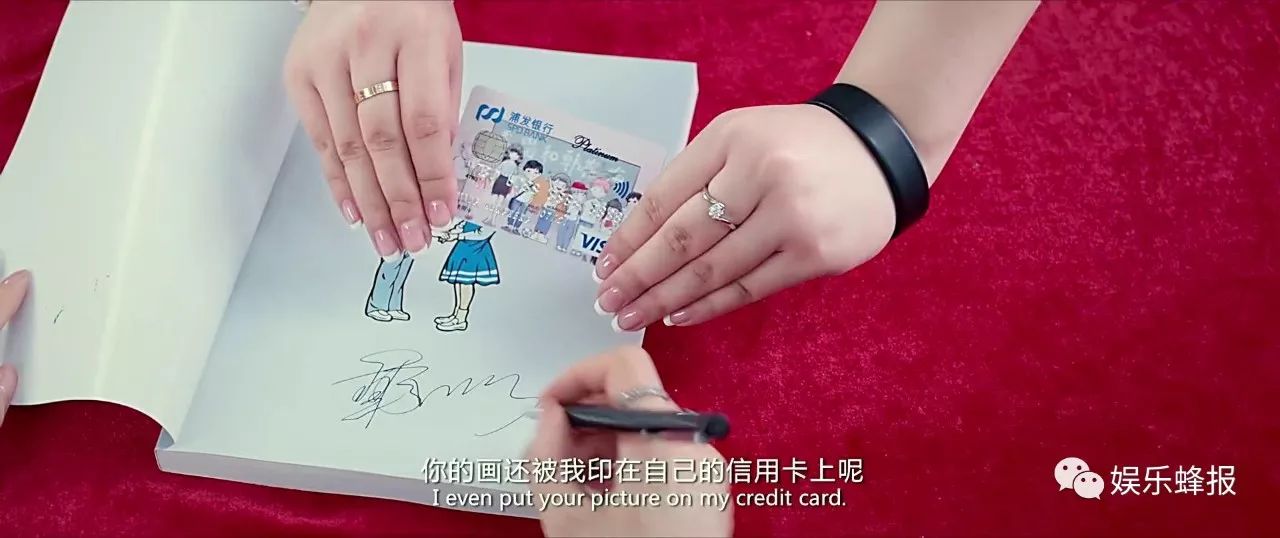 粉丝:“你的画还被我印在自己的信用卡上呢,这个信用卡的图案还可以自己挑选啊,对啊,这是浦发梦卡,私人定制呢”