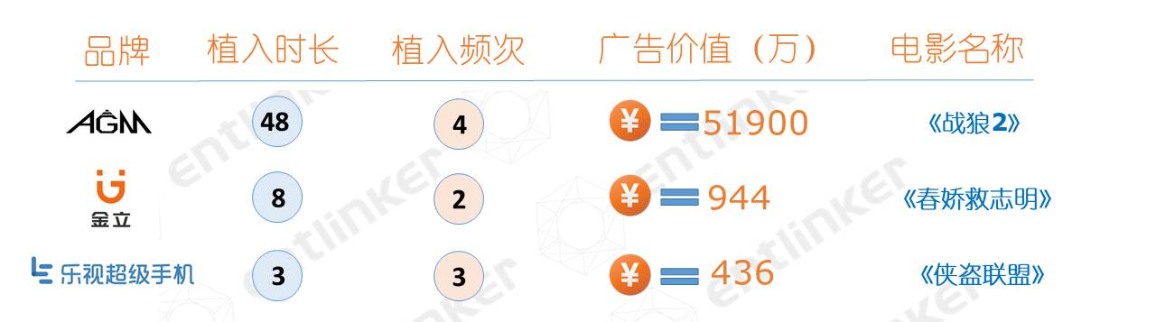 在此次的数据统计中,只有3个手机品牌的电影植入上榜。AGM的广告价值远超其他品牌。