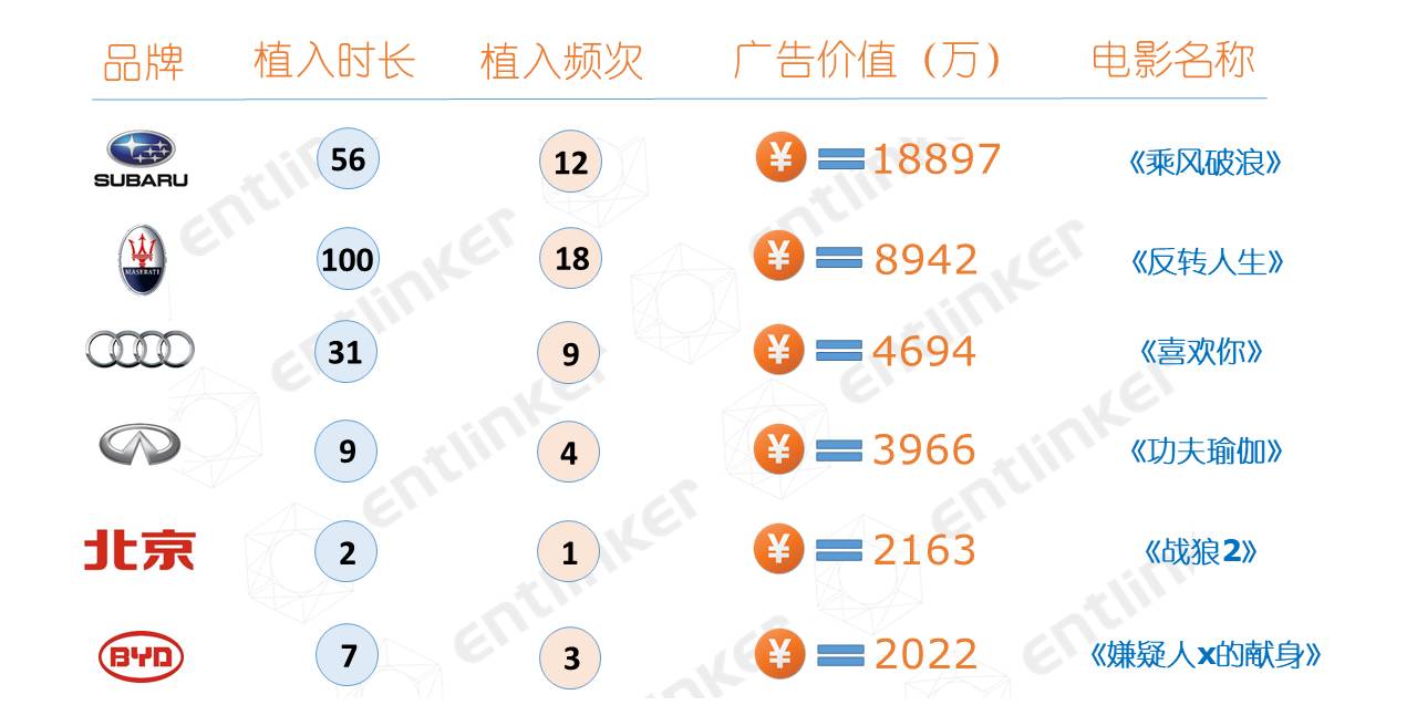 *以上植入时长、频次、广告价值是各品牌在电影中的“三高”镜头的总结。