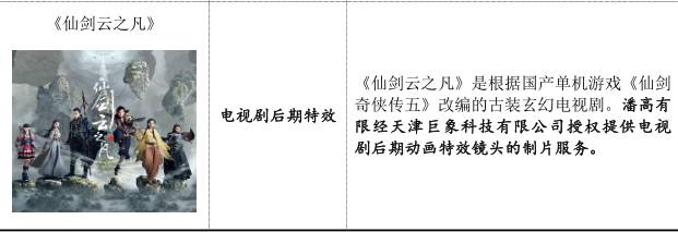攀高文化的产品主要是以知名 IP 改编的动画影视剧,也辅以真人实拍特摄影视剧、动画特效、动画宣传片等。公司负责作品的开发、制片管理及部分运营工作,在取得前期制片管理收入的同时,分享影片播映后的票房收益、后产品开发收益等后期运营收益。