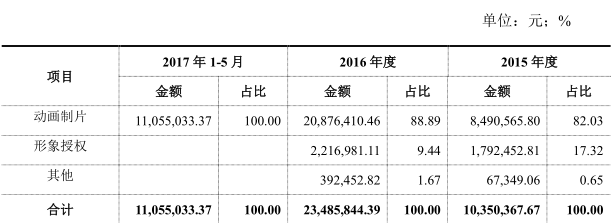 报告期内公司的收入来源主要为动画制片和形象授权。2017年 1-5月、2016年度和2015年度公司经审计的主营业务收入分别为 11,055,033.37元、23,485,844.39元和10,350,367.67元。