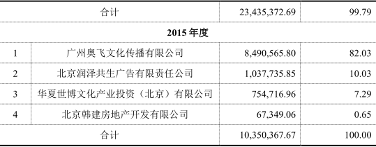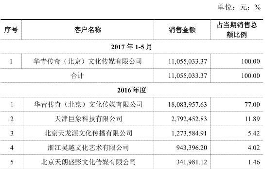 其中值得注意的是,攀高文化在2017年1-5月、2016年度和2015年度前五名客户销售额占主营业务收入总额比分别是100.00%、99.79%和100.00%。