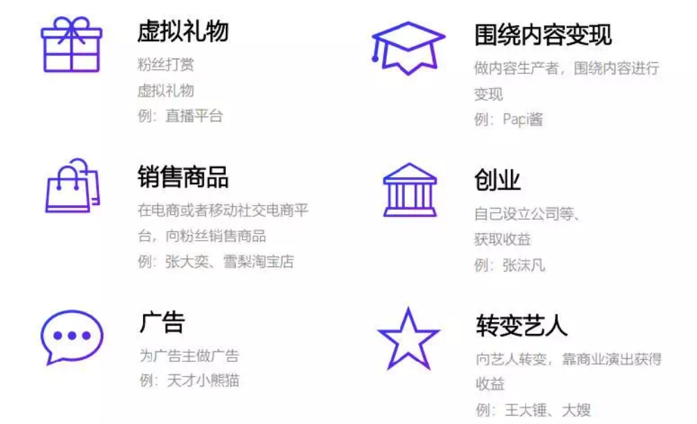4. 网红、机构和平台,联合多种服务形成“流量+内容”的生态产业链,对接用户形成多种形式的变现。