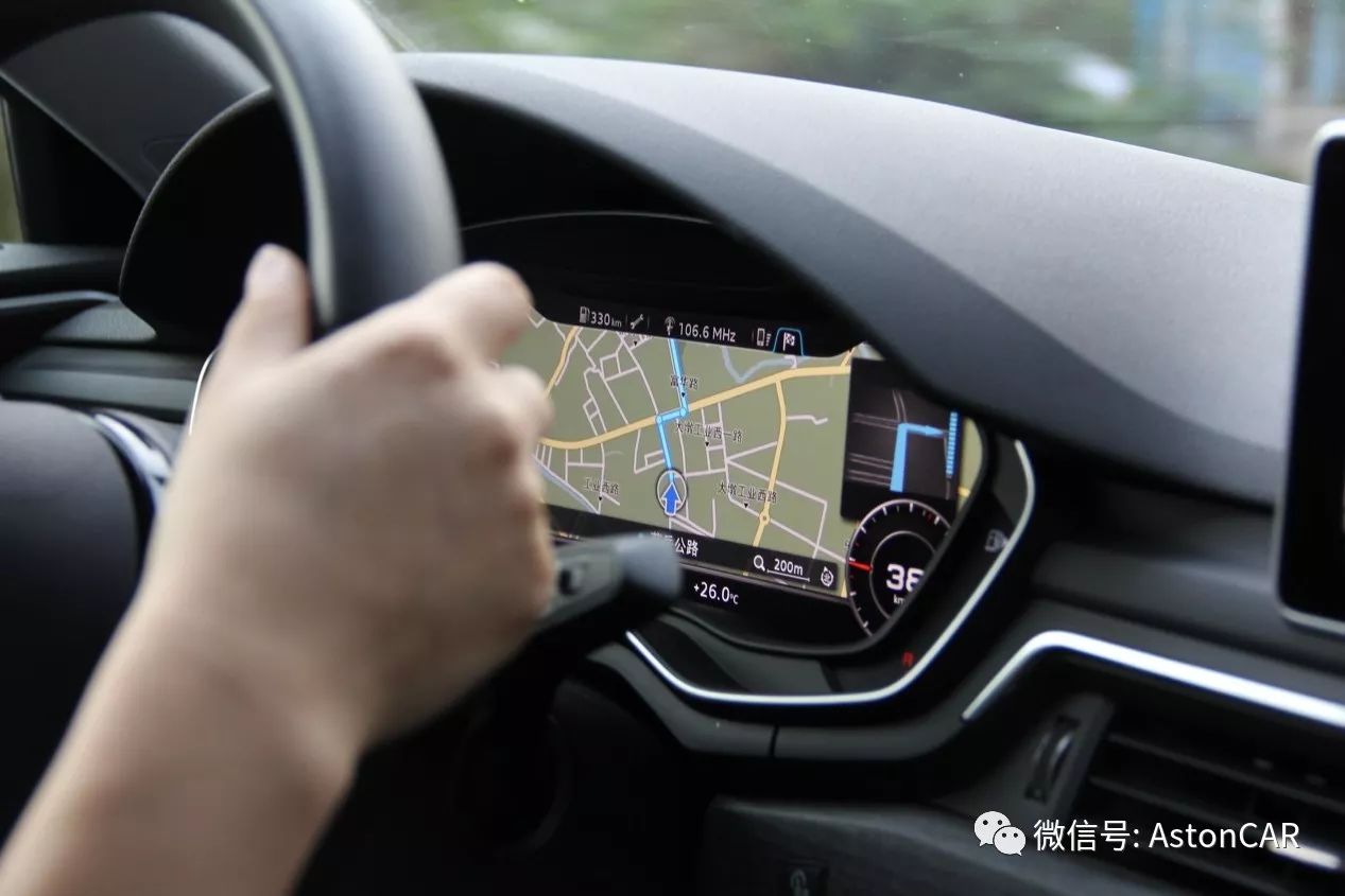 之所以愿意采用奥迪A4L自带地图,是因为在仪表盘上,奥迪A4L采用了一块特别大尺寸的液晶显示屏,虽然正常模式下显示信息有些多,但是一旦切换自带地图模式,对我的视觉冲击还是蛮大的,仪表盘显示的地图已经让中控显示屏退居二线了。如此,一切和驾驶有关的主要信息都会呈现在仪表盘的位置,这就是奥迪一直在宣传的“虚拟座舱”,冲击真的蛮大。