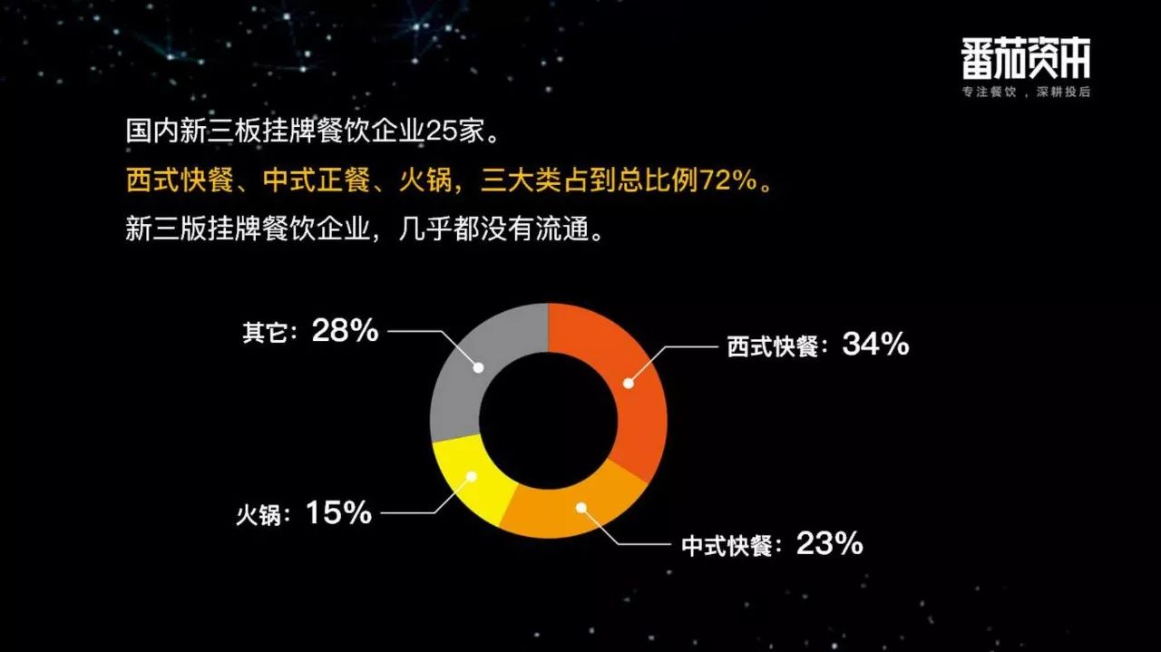 A 股市场和餐饮挂钩的只有 4 家,主营做餐饮的有一家都不做了。绝味食品偏向于做零售这方面。广州酒家也刚刚上市,偏重于食品制造。新三板上市的只有 25 家。相对于这么大的规模,只有这么几家上市公司。