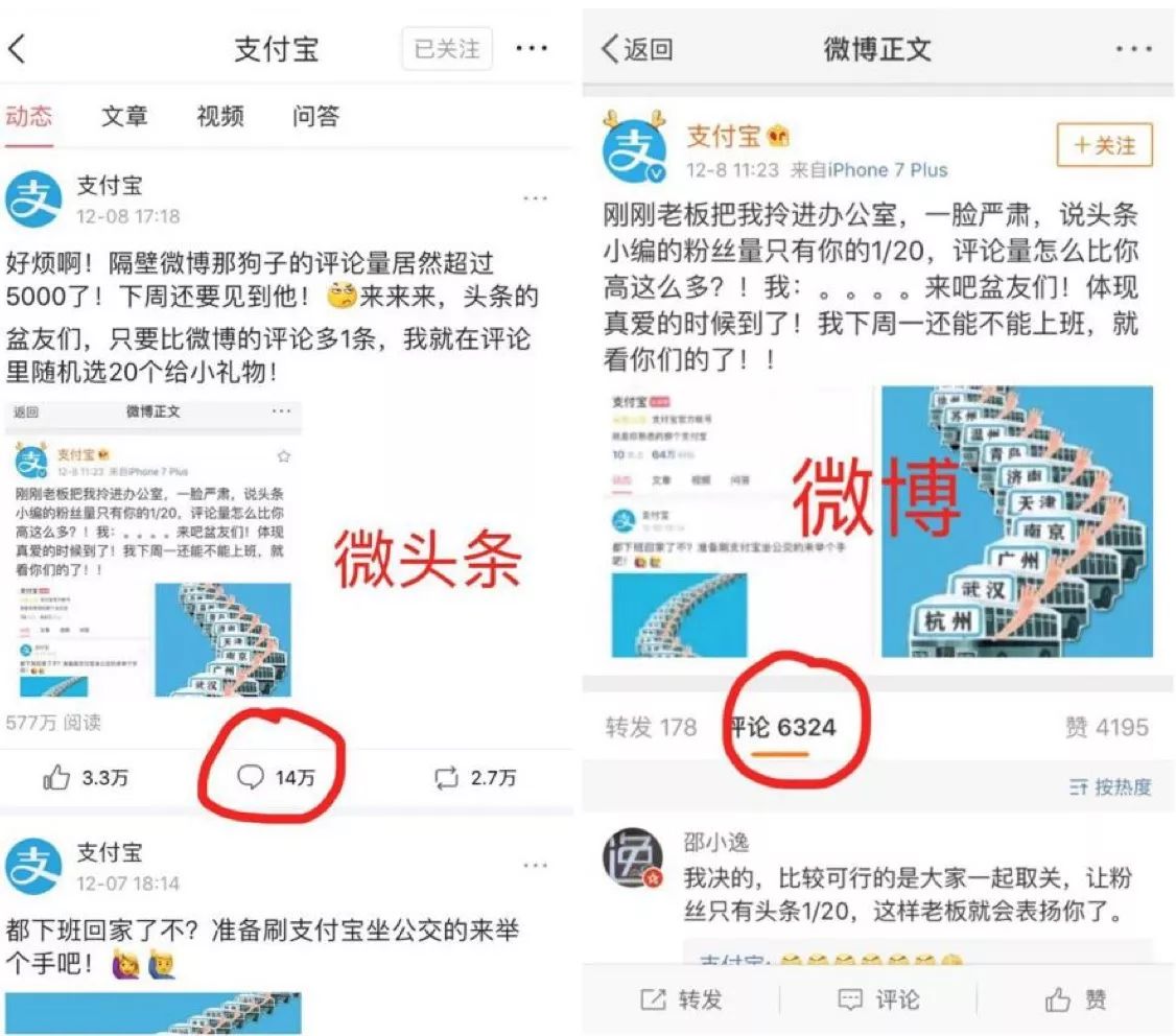 前几天支付宝小编的“内讧”很能证明这个问题——支付宝微博小编和支付宝微头条小编互相竞赛,支付宝微头条小编发出状态后不到一个小时,评论量过万;两个小时,评论量达到3.4万;截至12月10日下午,评论量已经突破13万。而支付宝的微头条账号,也在两天内狂涨5万粉丝。