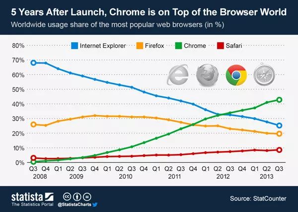 但是五年之后,Chrome已经成为超越了IE成为第一大浏览器,在市场上占据了主导地位,帮助谷歌成功避开了微软Bing搜索的威胁。随后劈柴还将浏览器逐步升级为Chrome OS操作系统,打开了新的市场。