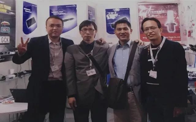 ▲2009年,彭彬(左一)在德国法兰克福汽配展