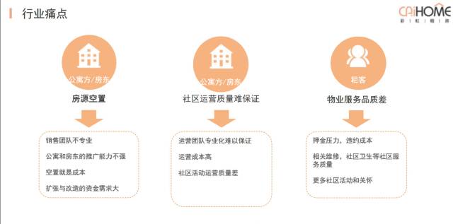 从行业痛点出发,彩虹租房为公寓方提供三项服务:公寓的去化、社区运营、物业托管。以此获得公寓方的信任。