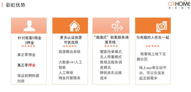 为了提高效率、降低成本,彩虹的看房采用了无人带看、“滴滴式”管家抢单和直联房东三种模式。注重社区运营,打出“与有趣的人住在一起”的名号。另外,彩虹租房还将推出7公里免费搬家,从打包到运输完全免费。