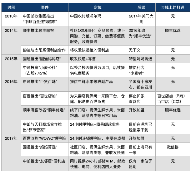 除了圆通,最开始试水应该是2014年5月顺丰开启的嘿客店。其利用快递网点或者社区门店将顺丰优选落地,试图以此打通线上线下客流,形成闭环。但2016年,部分嘿客因亏损被关闭,另一部分则更名为顺丰优选,并开始招募加盟者,才改以加盟模式开拓社区市场。