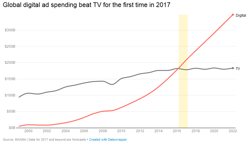 根据媒体购买公司IPG Mediabrands的调研分支Magna,2017年,全球网络广告支出达到2090亿美元,占广告市场的41%。同时,电视广告支出达到1780亿美元,占广告市场的35%。网络广告支出首次超过电视广告。
