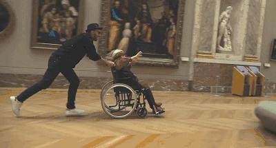 他会让瓦尔达坐在轮椅上,带着她在卢浮宫"飞驰"。