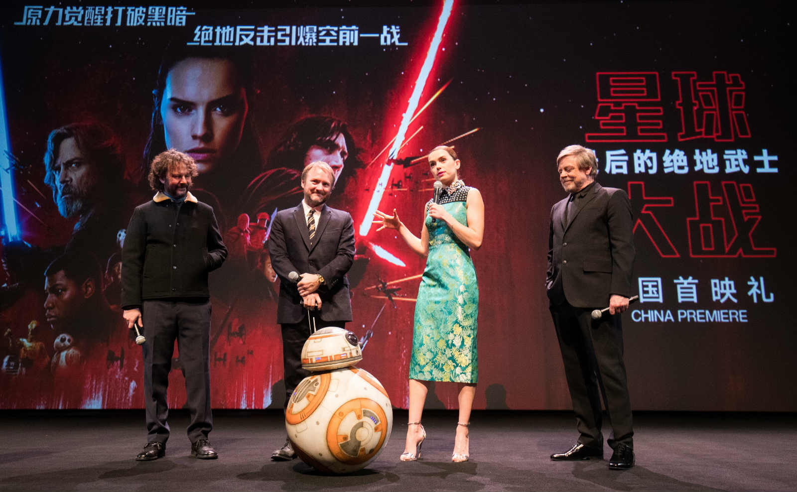 12月20日,由迪士尼影业发行、卢卡斯影业制作《星球大战:最后的绝地武士》于上海举办中国新闻发布会,并在上海迪士尼度假区举办盛大红毯仪式与首映礼,两代绝地武士的主演黛茜·雷德利、马克·哈米尔以及导演莱恩·约翰逊、制片人兰姆·伯格曼来到上海为影片宣传站台。