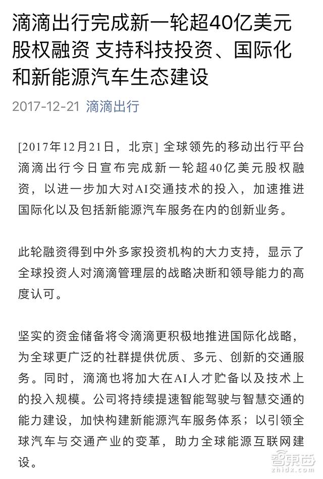 滴滴出行今日宣布完成由多家中外投资机构投资的新一轮股权融资,总金额超过40亿美元。滴滴方面表示,本轮融资将主要用于三个方面,一是加大对AI交通技术的投入,二是加速推进国际化进展,三是进一步扩大包括新能源汽车在内的创新业务。