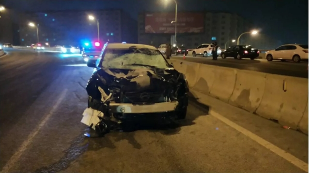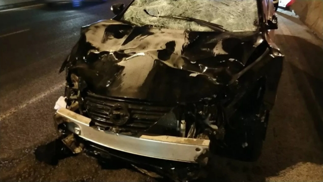 6时许,记者赶到现场看到,一辆黑色尼桑轿车停在和兴路往公路大桥方向,其车车头严重受损,车辆前风挡玻璃碎裂。