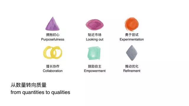 当然这些企业也在通过不同的方式进行效果衡量,但是他们不仅关注量化的财务指标,也关注提升内在品质的能力,我们已经发现了一系列帮助这些企业变得更成功的能力。这包括前面提到的初心,以及一个组织观察外部用户的能力,还有他们进行实验的能力。